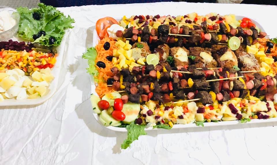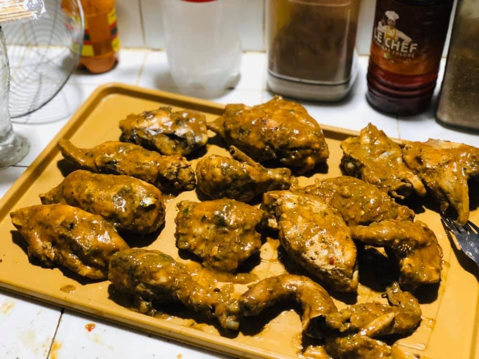 *les brochettes: j’ai d’abord cuit à la vapeur les morceaux de viande pour qu’ils soient tendre, ensuite je les passe à la marinade; j’y associe des saucisses de poulet et je grille le tout